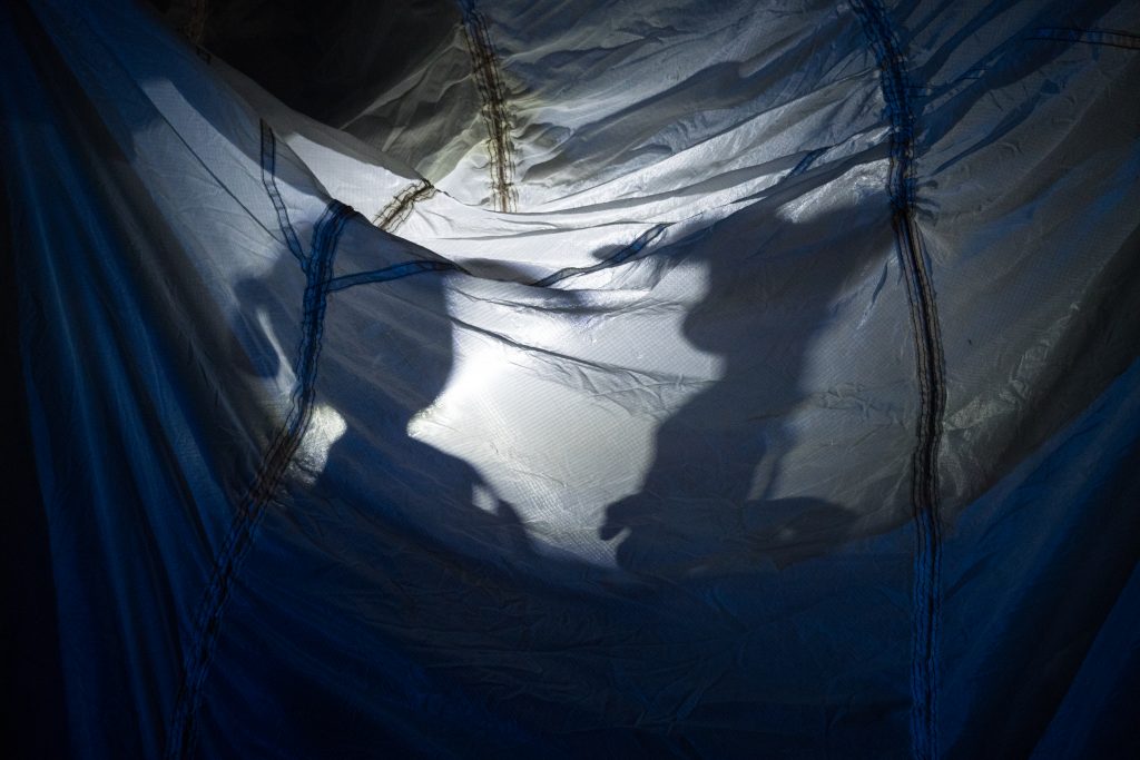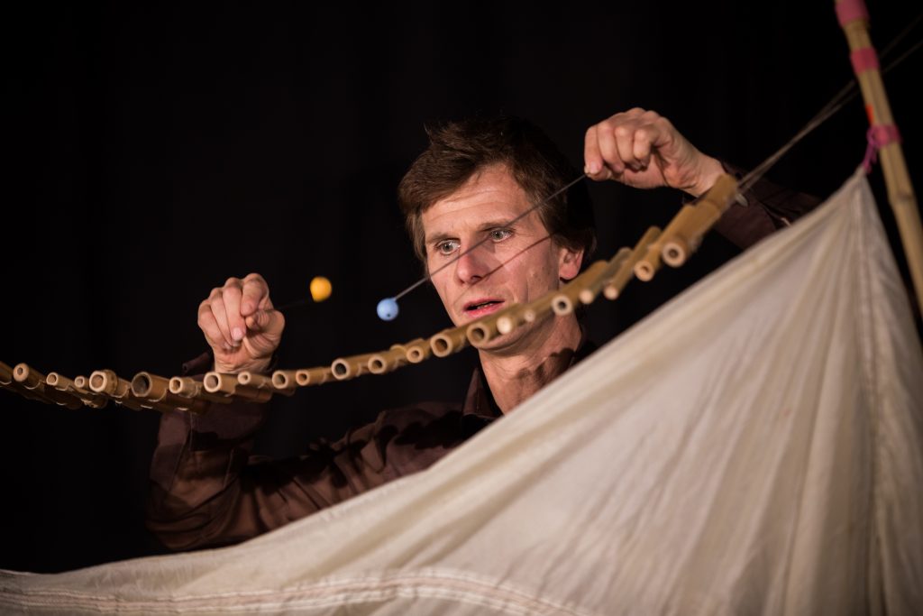 Mit Puppen und Regenwürmern, Zwischenspielen und Hängebrücken, Musik und Bambusstäben – auf und unter einem Fallschirm, der auf jeden Fall den Fall bremst.