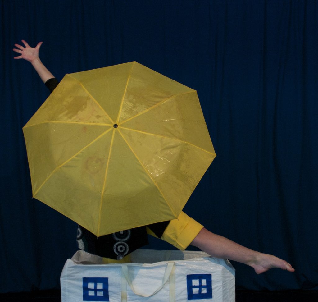 Eine Socke, ein Schirm, ein Tütenwimmel, eine Gummileine mit Wäscheklammern, Strohhalme, und eine gri-gra-große Tasche laden auf Entdeckungsreise ein. Die Spielerin malt mit Dingen des täglichen Gebrauchs Bilder in den Bühnenraum. Mit viel Bewegung und wenigen Worten entsteht ein clowneskes Spiel über das Ankommen und Bleiben. Kleine Wortspiele machen Lust auf Sprache. Das „Reinplappern“ ist kalkuliert, denn die Interaktion zwischen Kindern und Spielerin steht im Mittelpunkt dieses sinnlichen Wasserfestes, dessen Hauptrolle eine Socke spielt. Ideal für die spielzeugfreie Zeit.